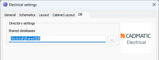 In the Electrical settings dialog, on the DB tab, you can define the location of shared databases. By default, the shared databases are located in Electrical\Shared\DB in the CADMATIC directory.