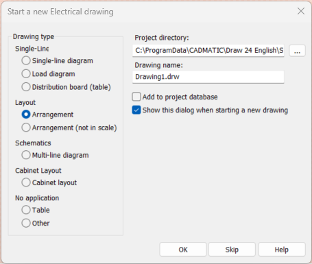 If the Show "Start a new Electrical drawing" dialog when starting a new drawing has been enabled in the general settings, the Start a new Electrical drawing dialog opens. When creating a new drawing using this guided function, you can be sure that all the necessary settings are correct. Furthermore, when you open a drawing with drawing type defined, the correct ribbon tab with suitable functions and symbols will automatically open. Also see Set drawing types.