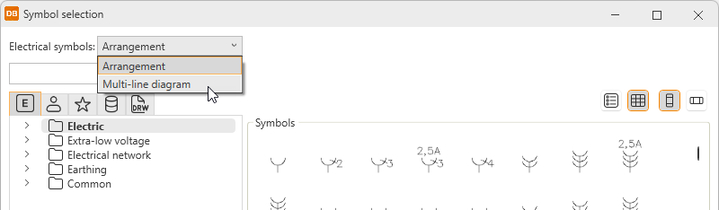 By default, the symbols are shown based on the drawing type but in some functions you can select another drawing type from the Electrical symbols drop-down menu.