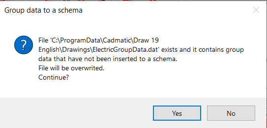 To read the groups from the drawing, select the groups you want from the layout drawing. Selection can be performed e.g. by windowing the entire drawing in order to export the groups of all distribution boards to a transfer file. The data is stored in the CADMATIC directory under filename ElectricGroupData.dat. If the file already exists and it contains such group data that has not yet been inserted in the distribution board schema, the user is notified of this by a dialog box. By responding 'Yes', the function overwrites the old file.
