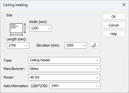 When you add the ceiling heating symbol to a product model, you can define the same information as when inserting the symbol. The information will then be saved as product model properties.