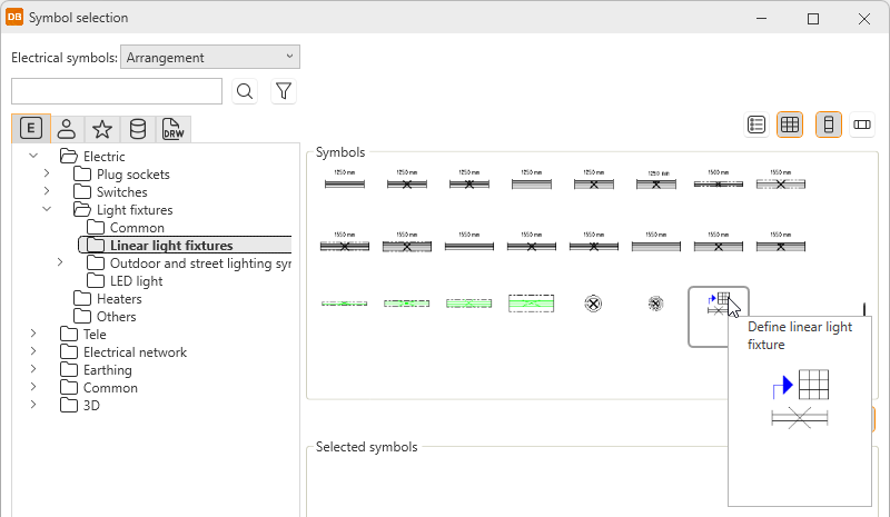 You can also start the function via a product model by selecting the Define linear light fixture option in the Symbol selection dialog.