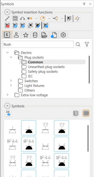 With this function, you can open the Symbols window. The window offers an easy way to view symbols and insert them into the drawing; the insertion functions are available in the same user interface. You can dock the window anywhere on the screen, and keep it open while working.