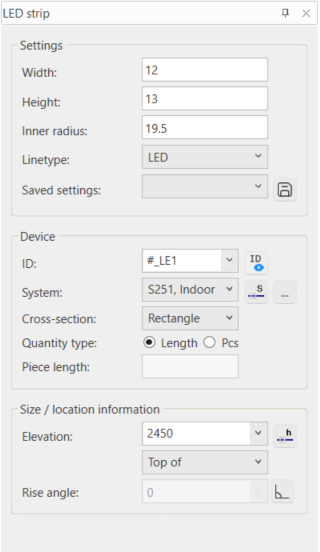 With this function, you can draw LED strip into the drawing. You can define the width and height along with other properties, just like for any other type of light fixtures.
