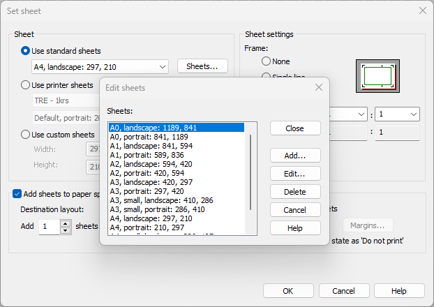 Use standard sheets – Select the size from the list. The sizes are stored to a text file Arkit.lue in the application folder.