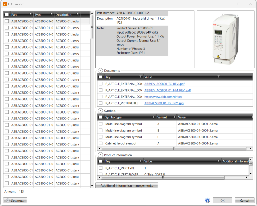 With this function, you can import product details into Electrical with an EDZ file. The EDZ files contain all the specifications for generating product models in Electrical: product information, symbols, product images, and manuals. In case all the information is not needed in Electrical, it is possible not to include them in the EDZ import.
