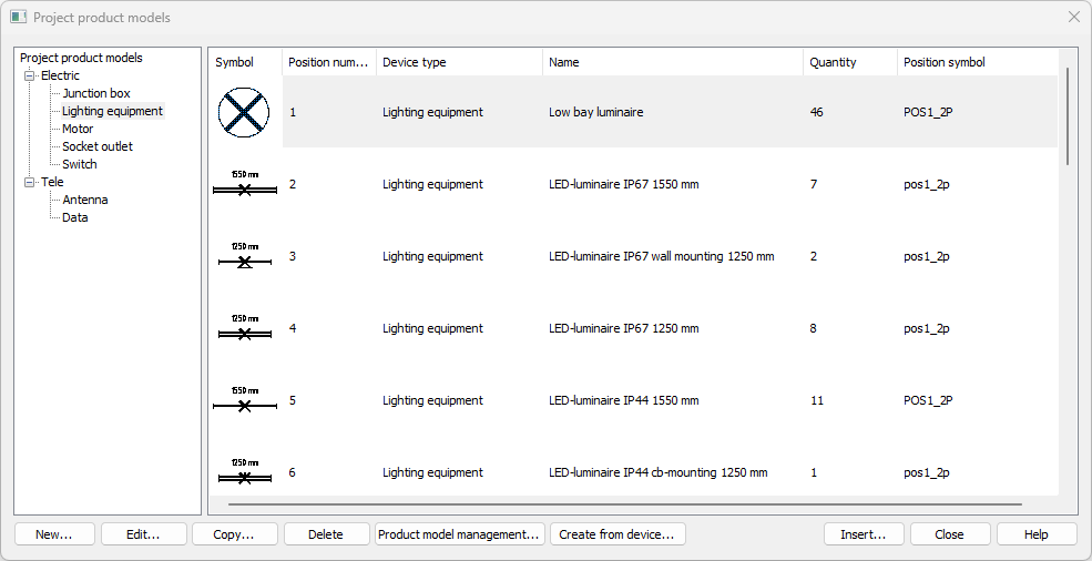 • If you want to create a new product model based on a symbol in the drawing, click Create from device and indicate the symbol from the drawing. The Product model properties dialog opens.