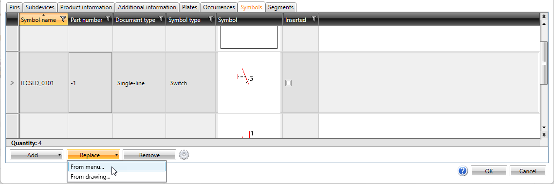 The type of the drawing affects replacing: If you are replacing a symbol of the same drawing type as that of the current drawing (single-line symbol / single-line diagram, for example), you have the option to select from the drawing or from a menu, or a file. If you are replacing a symbol of a different drawing type (single-line symbol / arrangement drawing, for example), you can only select from the menu or a file.