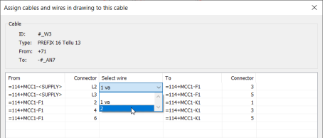 If necessary, change the wire to use by selecting it from the drop-down menu in the Select wire column. If a wire has occurrences, it is shown in the drop-down menu.