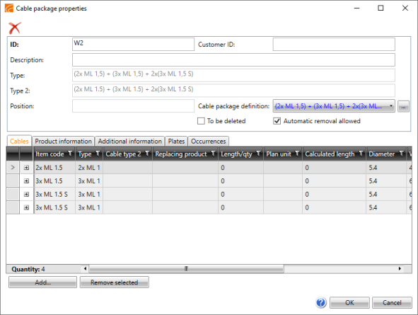 In this dialog, you can add and remove cables and add product information, additional information and plates to the cable package.