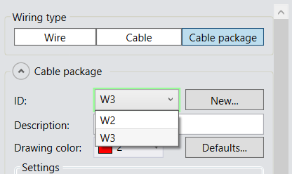 In the Wiring window, select an existing cable package from the ID drop-down menu. Alternatively, create a new cable package by clicking New.