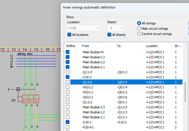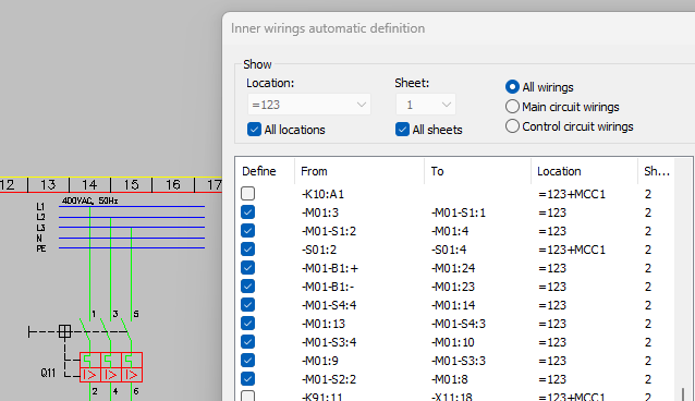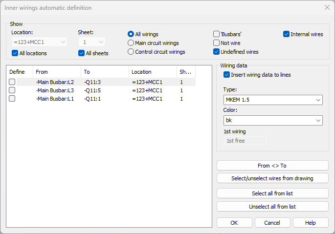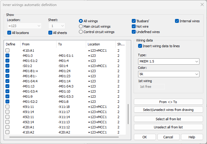 You can also open the function by selecting the lines/polylines in the drawing, right-clicking and selecting Automatic defining of internal wirings. The dialog then lists only the selected wires: