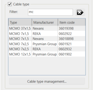 You can find the desired type easily by filtering: enter the character strings you want the type to include in the Filter field. The list of cable types only shows the cable types that include all the character strings you enter:
