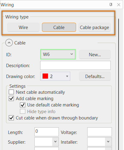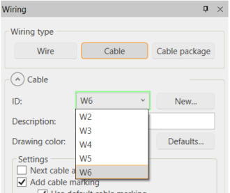You can also start drawing by right-clicking Cables in the Wirings project tree and selecting Draw cable.