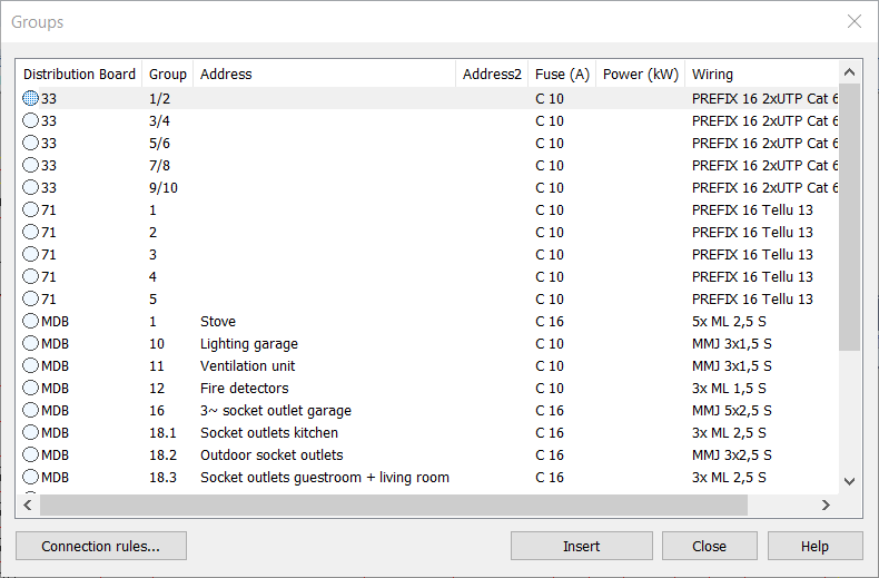• Create feeders of selected rows – Select rows from which to create a group (must have a group number and a distribution board ID in the drawing label).