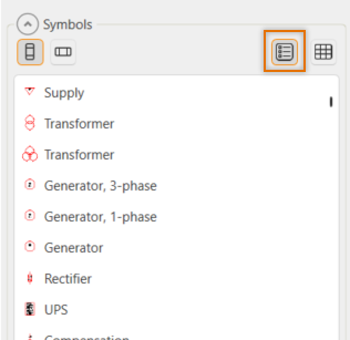 Symbols are shown according to your selection in the Symbols section in the middle of the window. If the active drawing has no drawing type defined or there are no symbols, multi-line diagram symbols will be shown.
