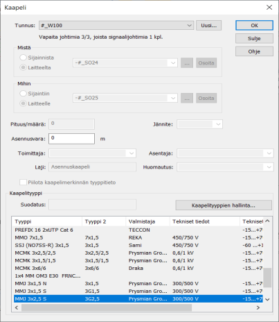 • Valitse kaapelityyppi listasta. Jos tarvitset uuden kaapelityypin, napsauta Kaapelityyppien hallinta  -painiketta, valitse kaapelityyppi ja napsauta Lisää projektiin  -painiketta.