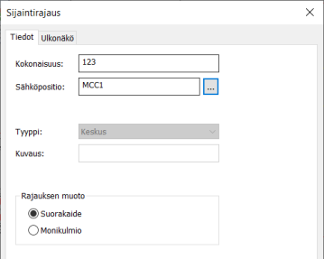 Syötä sijainti: kokonaisuus, sähköpositio tai molemmat. Sijaintirajauksen tunnus voidaan kirjoittaa kuvaan yhtenä tekstinä (=123+CS1) tai kahtena päällekkäisenä tekstinä (=123 ja +CS1).