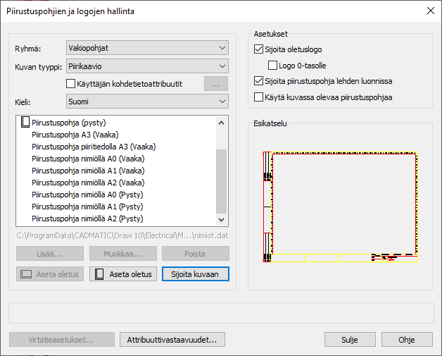 Aseta oletus – Piirustuspohjille voidaan valita oletuspiirustuspohja pystysuuntaisille ja vaakasuuntaisille pohjille erikseen. Kyseistä pohjaa käytetään, jos oletuspiirustuspohja/-logo sijoitetaan kuvaan.