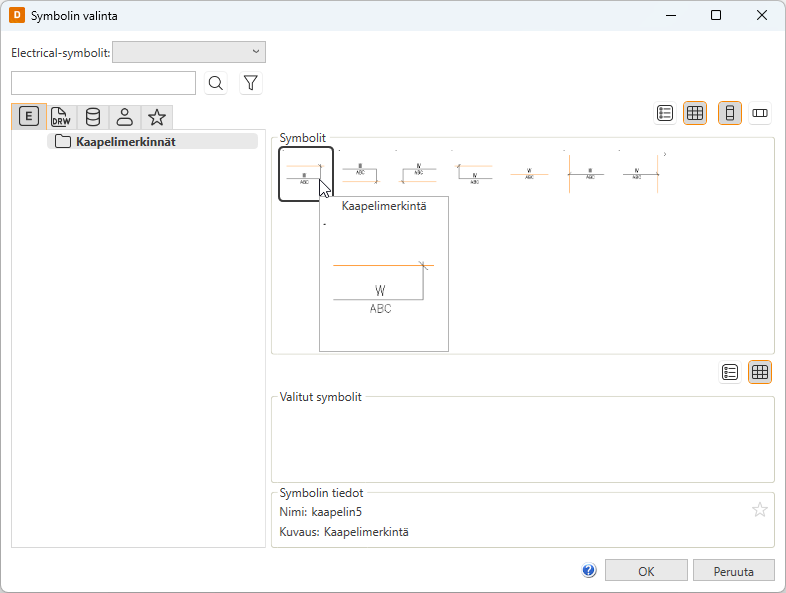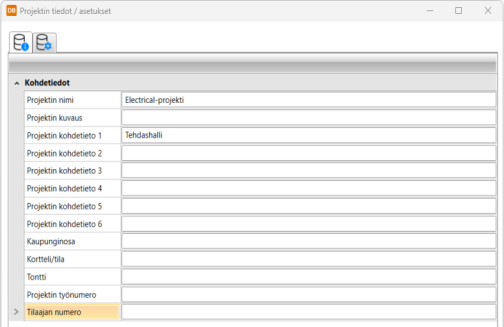 Valintanauhan lisäksi voit avata projektin tiedot/asetukset Electrical-ikkunasta