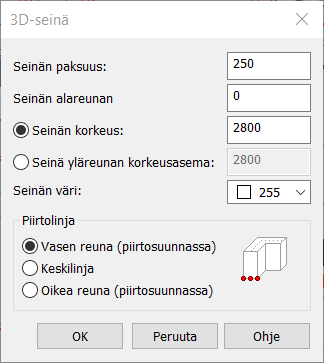 Valitse seinän piirtolinjaksi vasen, keski tai oikea. Piirtolinja määrää mihin seinä piirtyy suhteessa osoitettuun piirtolinjaan.