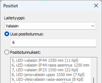 Positiotieto liitetään aina valaisin- tai lämmitinsymbolin positioattribuuttiin. Positiotieto voidaan täyttää käsin tai erillisellä toiminnolla, jolla on helppo jälkikäteen positioida useampia valaisimia ja lämmittimiä. Samalla voidaan kuvaan sijoittaa positiomerkintä kaikille valituille valaisimille.