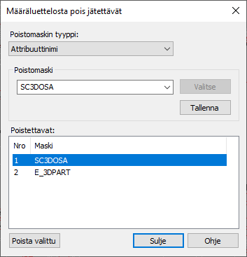 Määrälaskennassa voidaan jättää määriteltyjen elementtien määrät laskematta. Tämä tapahtuu määrittelemällä poistomaski, jota verrataan elementin ominaisuuksiin. Poistomaskiin sopivat elementit jäävät laskematta. Ominaisuuksia, joiden perusteella elementtejä suodatetaan on 5 kpl: