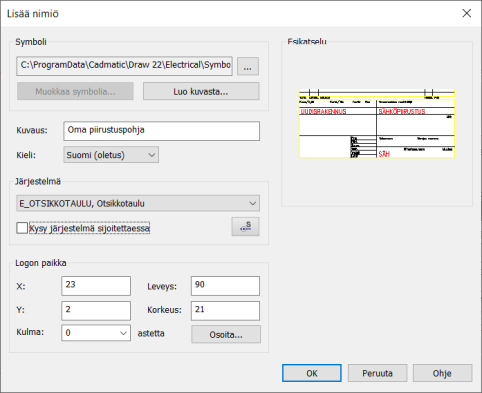 Voit luoda oman piirustupohjan/nimiön valitsemalla levyltä valmiin piirustuspohjasymbolin tai luomalla uuden piirustuspohjasymbolin kuvan elementeistä.