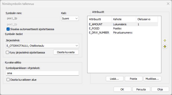 Voit käyttää omaa piirustuspohjasymbolia tehdessäsi apuna ohjelman mukana tulevia symboleita. Saat esimerkiksi kaikki tarvittavat attribuutit helposti omaan piirustuspohjaasi räjäyttämällä SPOH3V:n.