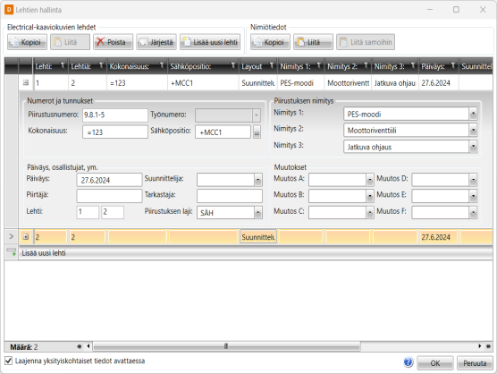 - Kopioi/Liitä – Kopioi lehti/lehdet leikepöydälle kaikkine tietoineen. Liitä-toiminto liittää lehdet alkuperäisillä lehtinumeroilla. Jos liitettävä lehtinumero on jo olemassa, lehti lisätään loppuun.