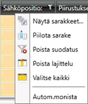 - Piilota sarake – Piilota valittu sarake. Sarake saadaan uudelleen näkyviin Näytä sarakkeet -toiminnosta.