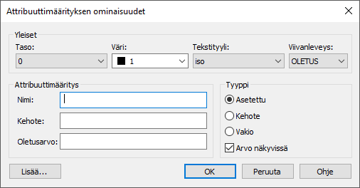 Voit muokata attribuuttimäärityksen nimeä, kehotetta, oletusarvoa, tyyppiä ja näkyvyyttä. Viivatyypin sijaan voit muokata tekstityyliä. Voit muokata muita tekstiasetuksia napsauttamalla Lisää-painiketta.