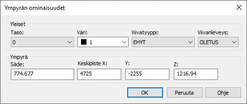 Voit muokata ympyrän sädettä ja keskipisteen koordinaatteja.