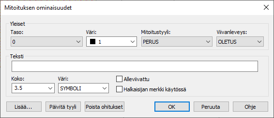Voit muokata mitoituksen tekstin sisältöä, kokoa ja väriä sekä halkaisijamerkkiä. Voit lisätä tekstiin alleviivauksen. Viivatyypin sijaan voit muokata mitoitustyyliä.
