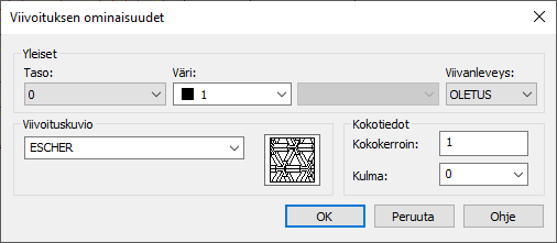 Voit muokata viivoituskuviota ja kuvion kokokerrointa ja kulmaa.