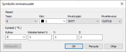 Voit muokata symbolin kulmaa ja kokokertoimia. Jos symbolilla on attribuutteja, voit muokata niitä napsauttamalla Attribuutit-painiketta.