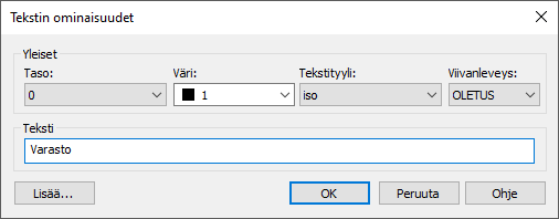 Voit muokata tekstielementin tekstiä. Viivatyypin sijaan voit muokata tekstityyliä. Voit muokata tekstiasetuksia napsauttamalla Lisää-painiketta. Katso lisätietoja kohdasta Määrittele tekstin asetukset.