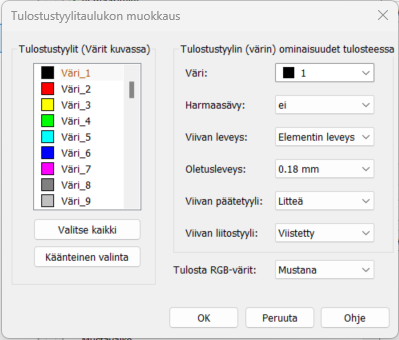 Napsauta Tulostustyyli-osion Ominaisuudet-painiketta. Valitse muokattava piirtoväri, ja määrittele ominaisuudet: