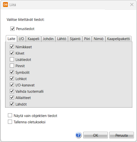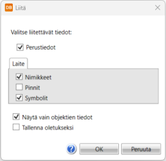 Asetukset – Kun Kopioi objektin tiedot on valittu, painike avaa Liitä-dialogin, jossa voit tarkemmin määritellä kopioitavat tiedot.