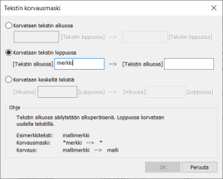 Etsi ja korvaa – Painike avaa Tekstin korvausmaski -dialogin, jossa voit etsiä ja korvata attribuuttien arvoja kaikilta riveiltä. Korvaus voidaan tehdä attribuuttiarvon alusta, lopusta tai keskeltä.