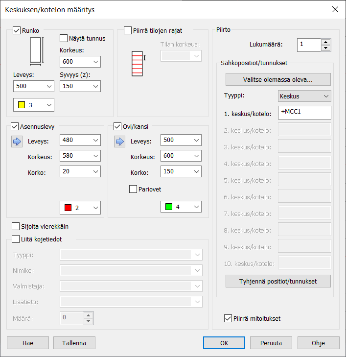 Valitse Keskuksen/kotelon määritys -dialogissa rungon, asennuslevyn ja kannen piirto ja määritä näiden mitat.