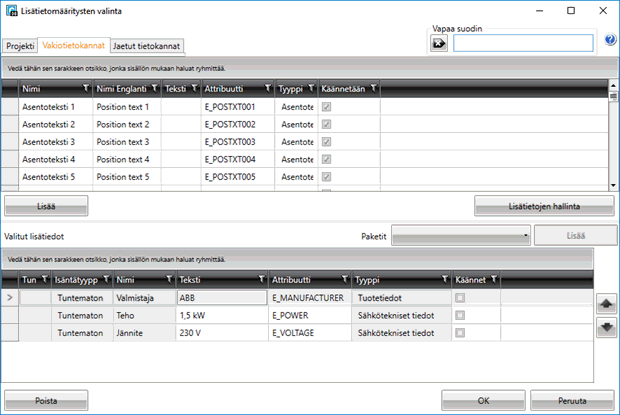 Voit poistaa valittuja lisätietoja valitsemalla ne alemmasta taulukosta ja napsauttamalla Poista.