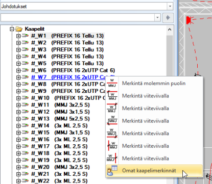 Kaapeli-valikon toiminnoilla voit sijoittaa kuvaan kaapelimerkinnän. Kaapelimerkintätapoja on useita, joten voit valita tavan tarpeesi mukaan. Voit myös luoda omia kaapelimerkintöjäsi.