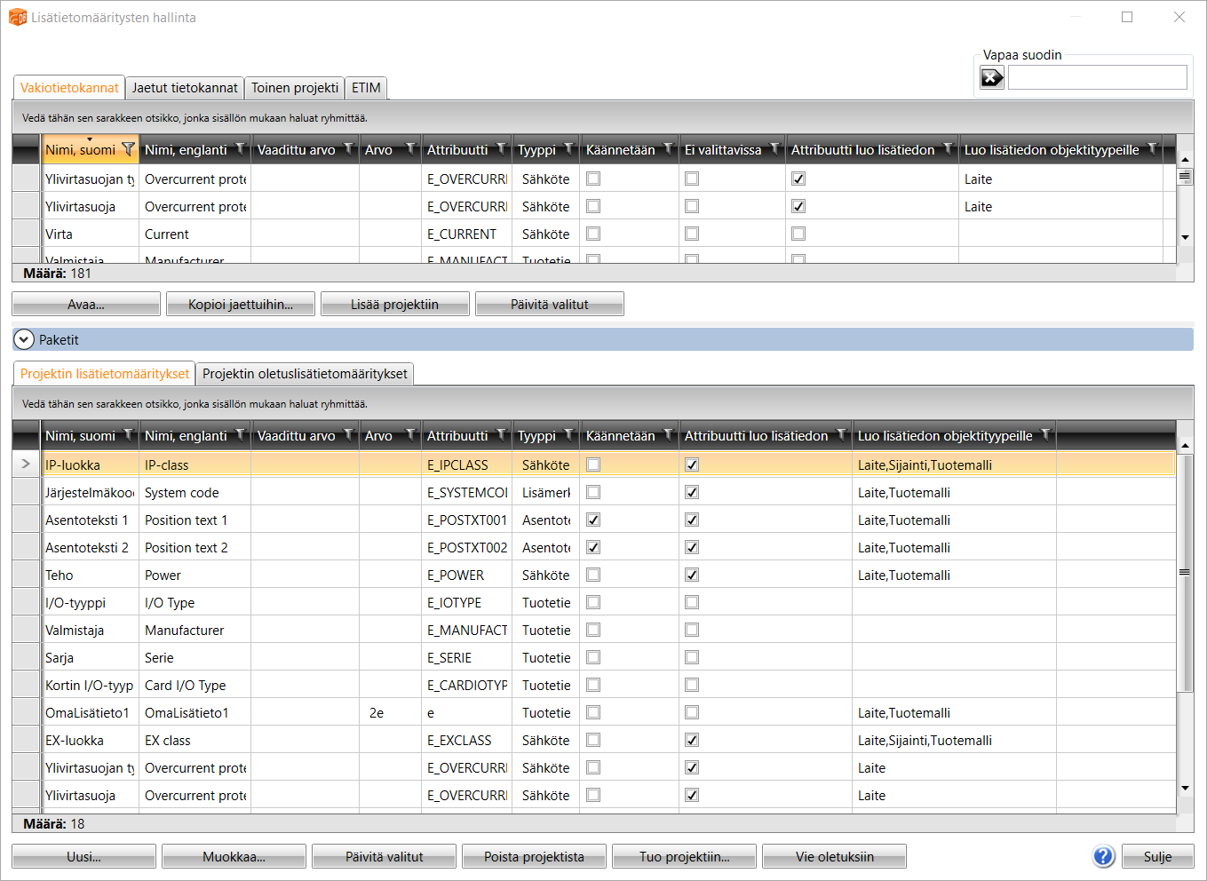 Lisätietomäärityksiä hallitaan hallintatyökalun avulla.