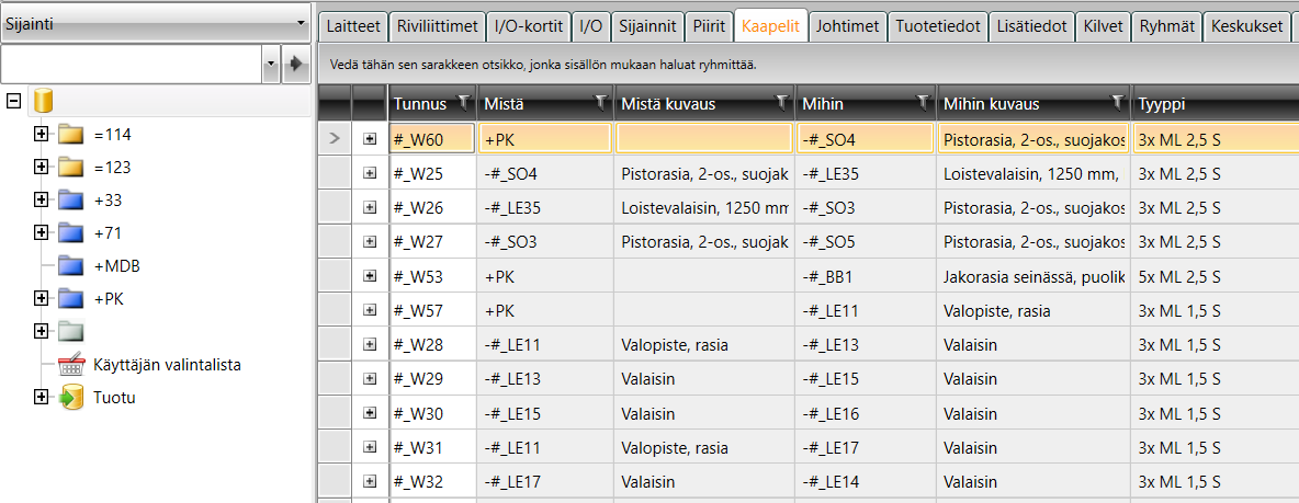Kaapelit-välilehdellä näkyvät projektin kaapelit ja niiden johtimet kytkentöineen ryhmiteltynä esim. sijainnin mukaan.