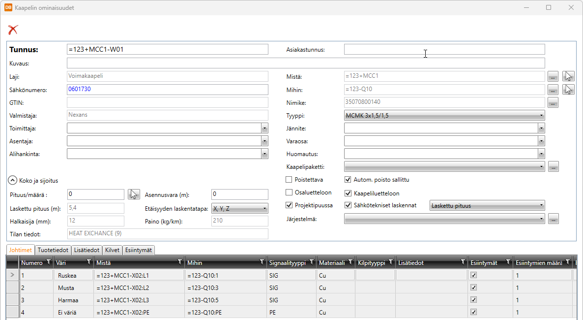 Johtimet-välilehdellä näkyvät kaapelin johtimet. Napsauta haluamaasi johdinta hiiren kakkospainikkeella ja valitse haluamasi toiminto.