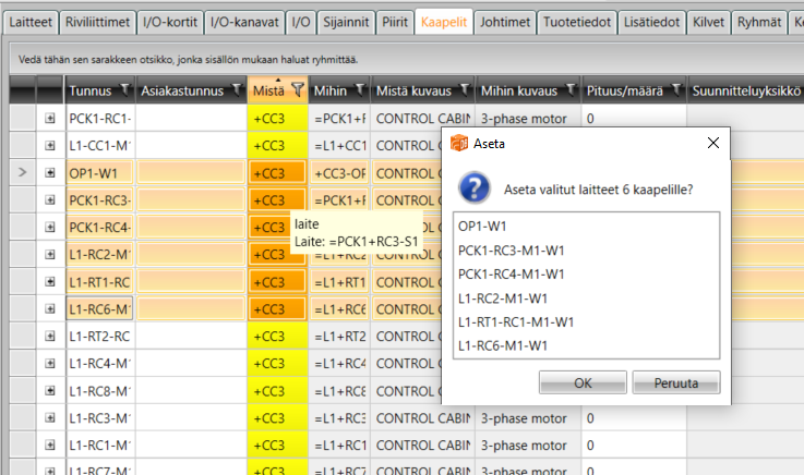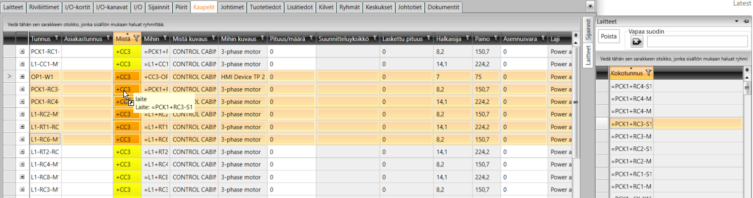 Kaapelit-välilehden oikeassa reunassa on kaksi apugridiä: Laitteet ja Sijainnit. Saat helposti määriteltyä kaapelien Mistä- ja Mihin-tietoja massana vetämällä tiedot apugrideistä päägridiin.