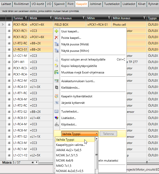 Voit vaihtaa kaapelityypin valitsemalla haluamasi kaapelit, painamalla hiiren kakkospainiketta ja valitsemalla Vaihda tyyppi -vaihtoehdon. Listassa näkyy projektissa olevat kaapelityypit. Jos haluat valita kaikista tietokannan kaapelityypeistä, valitse Kaapelityypin valinta.