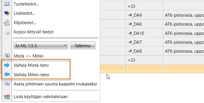 Voit vaihtaa kaapelin Mistä- ja Mihin-tietoja painamalla hiiren kakkospainiketta, valitsemalla haluamasi kaapelit ja valitsemalla Vaihda Mistä-tieto tai Vaihda Mihin-tieto. Muokkaaminen on mahdollista silloin, kun kaapelilla ei ole esiintymiä, jotka ohjaavat Mistä-/Mihin-tietoa.