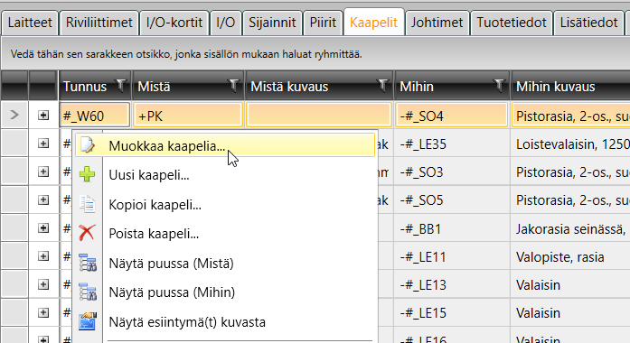 Kaapelit-välilehdellä voit muokata taustaväriltään valkoisten solujen tietoja suoraan gridissä. Lisäksi voit muuttaa gridin kautta kaapelityyppiä sekä Mistä- ja Mihin-tietoja.
